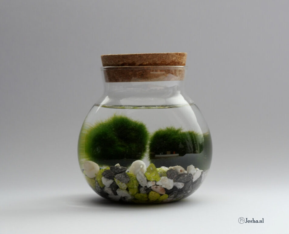 Zodra je thuis bent is het het beste om de marimo even in vers water te zetten. Je kan het oude water weggooien.